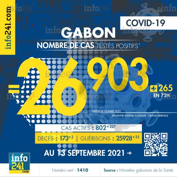 Bilan épidémiologique du Gabon au 13 septembre 2021 : 265 nouveaux cas enregistrés en 72h dans l’Estuaire (247 cas), l’Ogooué-Maritime (7 cas), le Woleu-Ntem (6 cas), le Haut-Ogooué (4 cas) et l’Ogooué-Ivindo (1 cas). Il y a eu 3 nouveaux décès et 35 nouvelles guérisons.