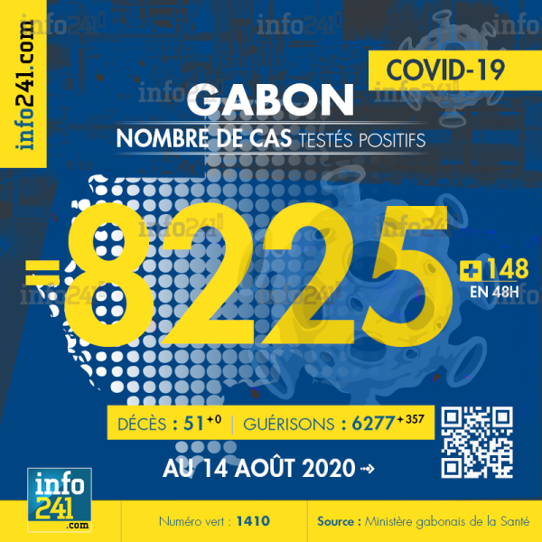 Bilan épidémiologique du Gabon au 14 août 2020 : 148 nouveaux cas enregistrés en 48h dans l’Ogooué-Maritime (89 cas), l’Estuaire (51 cas) et le Haut-Ogooué (8 cas). Il y a eu aucun nouveau décès et 357 nouvelles guérisons.