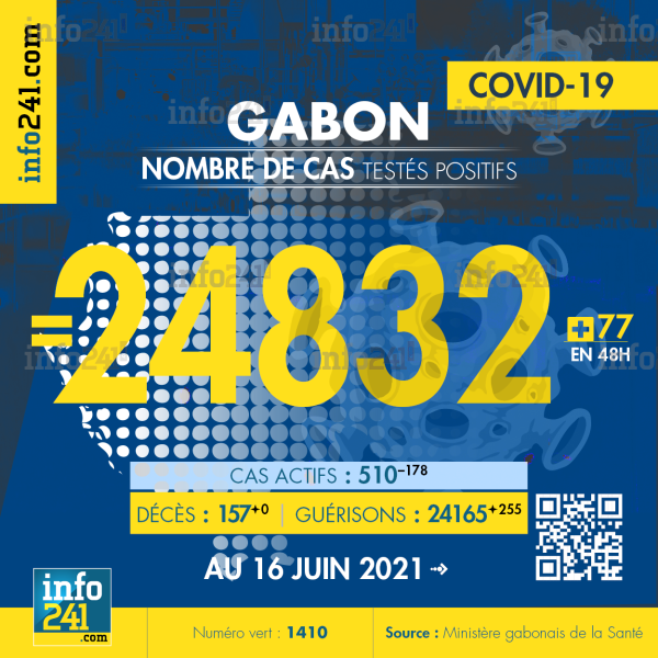 Ce qui porte le bilan à 24 832 cas confirmés, 157 décès et 24 165 guérisons. Le Gabon compte actuellement 510(-178) cas actifs de la pandémie officiellement déclarés. Parmi eux 29(-3) patients hospitalisés dans le pays dont 12(-6) en réanimation.