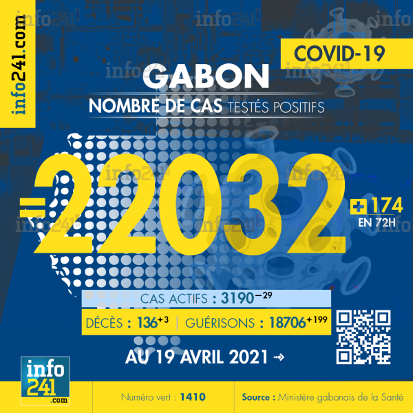 Ce qui porte le bilan à 22 032 cas confirmés, 136 décès et 18 706 guérisons. Le Gabon compte actuellement 3 190(-29) cas actifs de la pandémie officiellement déclarés. Parmi eux 90(+13) patients hospitalisés dans le pays dont 34(+15) en réanimation.