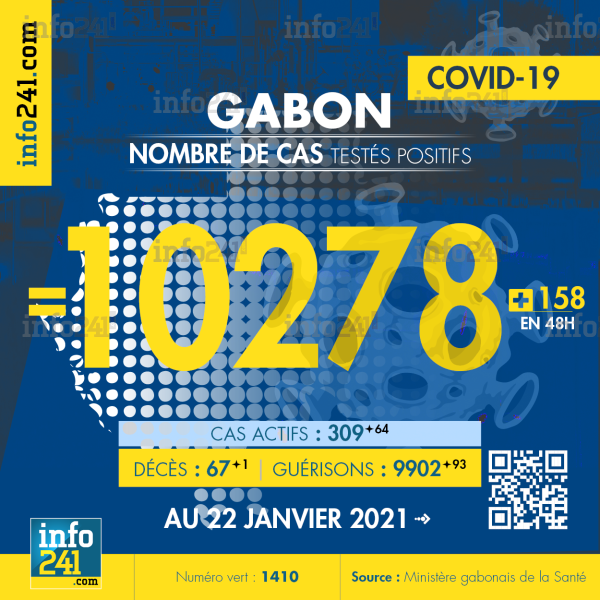 Ce qui porte le bilan à 10 278 cas confirmés, 67 décès et 9 902 guérisons. Le Gabon compte actuellement 309(+64) cas actifs de la pandémie officiellement déclarés. Parmi eux 29(+5) patients hospitalisés dans le pays dont 10(-1) en réanimation.