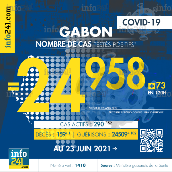 Ce qui porte le bilan à 24 958 cas confirmés, 159 décès et 24 509 guérisons. Le Gabon compte actuellement 290(-152) cas actifs de la pandémie officiellement déclarés. Parmi eux 18(-5) patients hospitalisés dans le pays dont 10(+1) en réanimation.