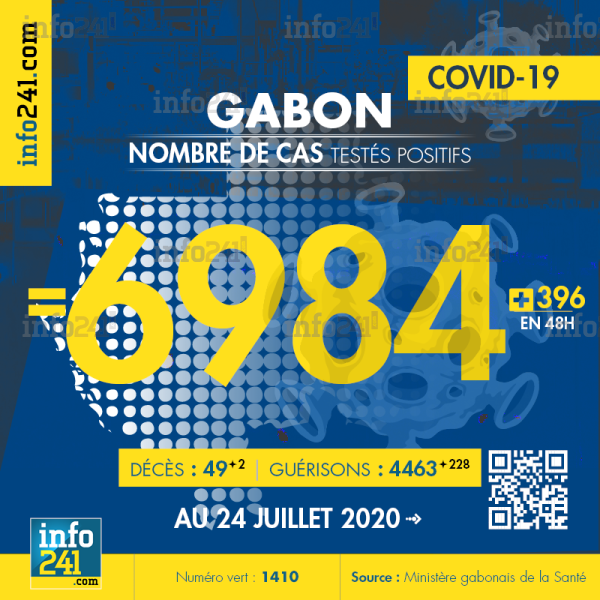 Bilan épidémiologique du Gabon au 24 juillet 2020 : 396 nouveaux cas enregistrés en 48h dans l’Ogooué-maritime (146 cas), l’Estuaire (128 cas), le Moyen-Ogooué (46 cas), la Ngounié (32 cas), le Haut-Ogooué (19 cas), l’Ogooué-Lolo (17 cas), le Woleu-Ntem (4 cas) et la Nyanga (4 cas). Il y a eu deux nouveaux décès et 228 nouvelles guérisons.
