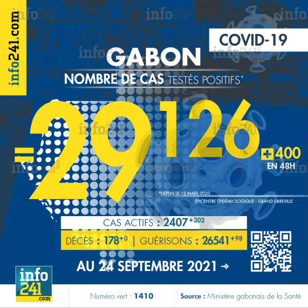 Bilan épidémiologique du Gabon au 24 septembre 2021 : 400 nouveaux cas enregistrés en 48h dans l’Estuaire (373 cas), l’Ogooué-Maritime (11 cas), le Haut-Ogooué (6 cas), le Woleu-Ntem (4 cas), le Moyen-Ogooué (3 cas) et l’Ogooué-Lolo (3 cas). Il y a eu aucun nouveau décès et 98 nouvelles guérisons.