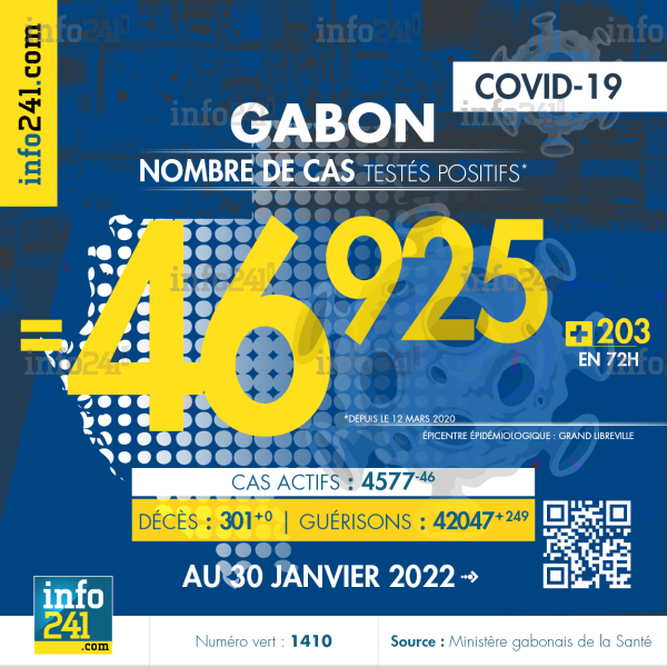 Bilan épidémiologique du Gabon au 30 janvier 2022 : 203 nouveaux cas enregistrés en 72 dans l’Ogooué-Maritime (147 cas) et l’Estuaire (56 cas). Il y a eu aucun nouveau décès et 249 nouvelles guérisons.