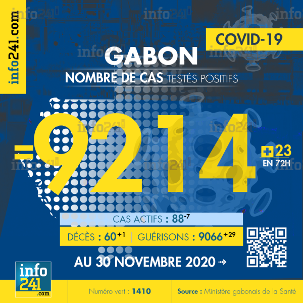 Ce qui porte le bilan à 9 214 cas confirmés, 60 décès et 9 066 guérisons. Le Gabon compte actuellement 88(-7) cas actifs de la pandémie officiellement déclarés. Parmi eux 7(-2) patients hospitalisés dans le pays dont 7(-1) en réanimation.