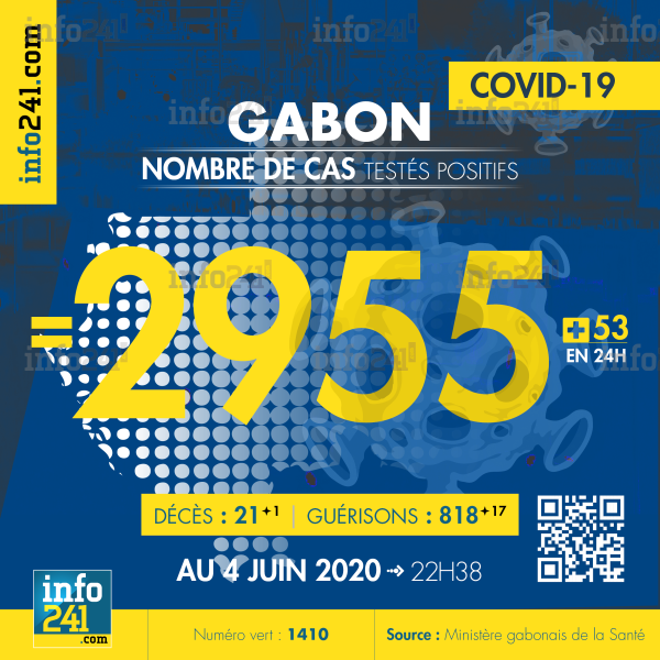 Coronavirus : le bilan épidémiologique du Gabon au 4 juin 2020 : 53 nouveaux cas enregistrés en 24h dans l’Estuaire. Il y a eu un nouveau décès et 17 nouvelles guérisons. Ce qui porte le bilan à 2 955 cas confirmés, 21 décès et 818 guérisons.Il y a actuellement 99(+0) patients hospitalisés dans le pays dont 15 (+0) en réanimation.