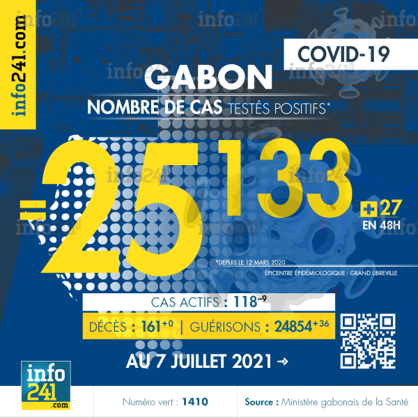 Ce qui porte le bilan à 25 133 cas confirmés, 161 décès et 24 854 guérisons. Le Gabon compte actuellement 118(-9) cas actifs de la pandémie officiellement déclarés. Parmi eux 16 patients hospitalisés dans le pays dont 9 en réanimation.