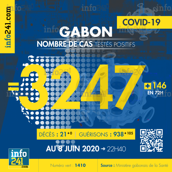 Coronavirus : le bilan épidémiologique du Gabon au 8 juin 2020 : 146 nouveaux cas enregistrés en 72h dans l’Estuaire (136 cas) et le Moyen-Ogooué (10 cas). Il y a eu aucun nouveau décès et 105 nouvelles guérisons. Ce qui porte le bilan à 3 247 cas confirmés, 21 décès et 938 guérisons.s. Il y a actuellement 112(+21) patients hospitalisés dans le pays dont 18 (+5) en réanimation.