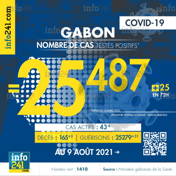 Ce qui porte le bilan à 25 487 cas confirmés, 165 décès et 25 279 guérisons. Le Gabon compte actuellement 43 (-6) cas actifs de la pandémie officiellement déclarés. Parmi eux 11 (+1) patients hospitalisés dans le pays dont 6 (-2) en réanimation.
