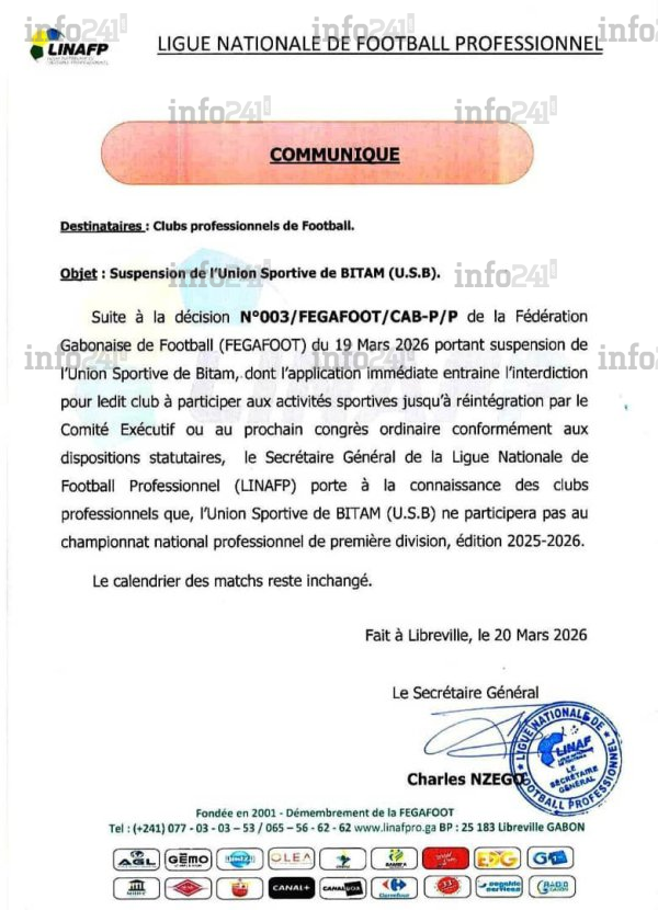 Le communiqué de la Linafp parvenu à Info241, adressé à l’ensemble des clubs professionnels, est dûment signé par le secrétaire général de la Linafp, Charles Nzego. Il vient matérialiser sur le terrain les conséquences de la crise interne qui déchire l’équipe depuis plusieurs mois entre les camps de Billy Bendo Edo et Sammy Edgar Mvé Essono. Il précise clairement que l’application immédiate de la décision fédérale entraîne l’interdiction formelle pour le club bitamois de participer aux activités sportives.