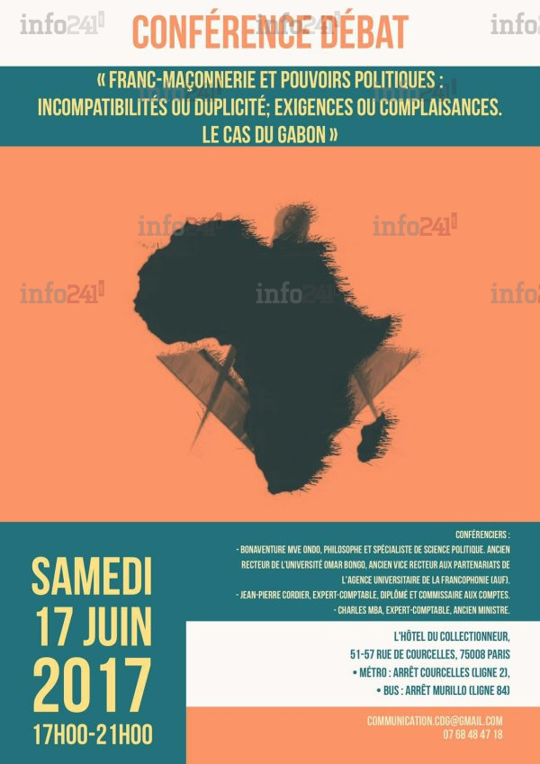 La diaspora gabonaise semble vouloir briser les tabous qui confisquent leur pays. A cet effet, La Convention de la Diaspora Gabonaise (CDG) organise une conférence le samedi 17 juin 2017 à Paris (Hôtel du Collectionneur 51-57 Rue de Courcelles, 75008 Paris ) , autour du thème : Franc-maçonnerie et pouvoirs politiques en Afrique : incompatibilités ou duplicité ; exigences et complaisances. Le cas du Gabon.