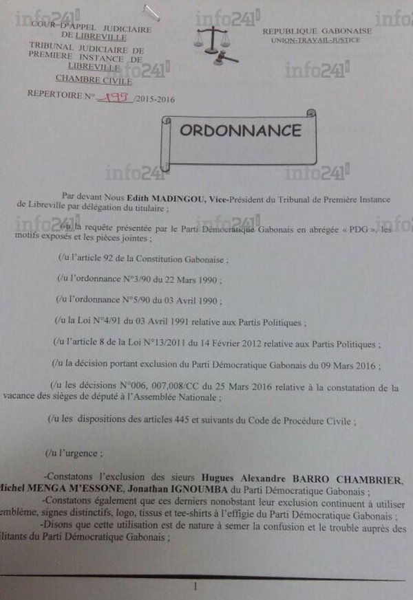 Selon l’ordonnance du tribunal signée de la vice-présidente du tribunal de première instance de Libreville, Edith Madingou, interdiction a été faite à Hugues Alexandre Barro Chambrier, Michel Menga M’Essone et Jonathan Ingnoumba ainsi qu’à tous les membres de leur équipe « d’utiliser la dénomination du Parti démocratique gabonais, son emblème et ses signes distinctifs ».