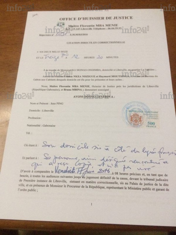 La convocation de Jean Ping notifiée par un huissier de justice