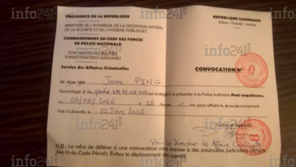 Interrogé par Info241, une source proche de Jean Ping indique ce qui suit : « à deux jours de son départ pour une nouvelle tournée dans la Province du Moyen-Ogooué, Jean Ping a reçu aujourd’hui à son domicile par voie de porteur, une convocation à la police judiciaire. Il est attendu le jour suivant, vendredi 3 juin 2016, à 10h. »