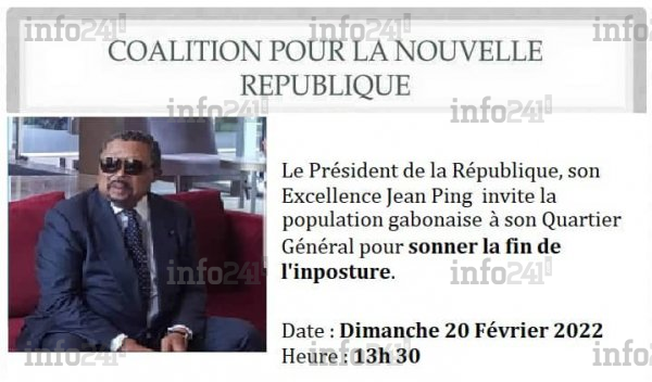 Puis depuis 72 heures, un tract circule à travers les réseaux sociaux annonçant une importante déclaration du leader de la Coalition pour la nouvelle république (CNR) le dimanche 20 février 2022 dès 13h30 à son QG. Et ce, en présence de l’ensemble des représentants des 9 coordinations provinciales de cette coalition en sus des « populations gabonaises » dans leur ensemble.