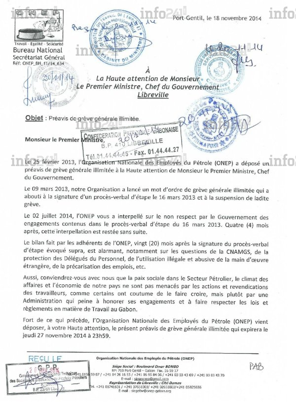 L’Onep pose comme préalables aux négociations, la suspension des prélèvements de la Caisse nationale d’assurance maladie (CNAMGS) auprès de ses adhérents, le remboursement des sommes déjà prélevées, l’annulation des représailles contre le personnel de la société pétrolière Perenco, le départ du directeur général de Oil Libya et le limogeage du directeur général de la société française STSI Boccard, sous-traitant de Total-Gabon.