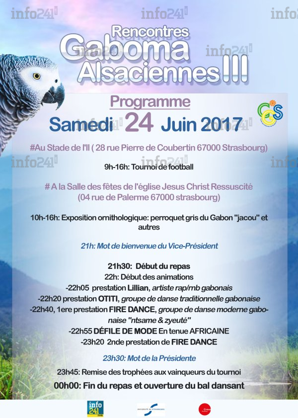En effet, a-t-elle indiqué« un tournoi de football se déroulera de 09 à 14h au stade de l’Ill et mettra en lice plusieurs équipes évoluant dans la communauté urbaine de Strasbourg (CUS).Mais aussi, une exposition ornithologique animée par L’association Perroquet Club Nord Alsace, débutera à 10h.Cela, non seulement afin d’éveiller la curiosité de nos convives mais aussi faire porter à connaissance de ces derniers l’existence du "perroquet gris" qui rèvèle la richesse et le patrimoine du Gabon » .