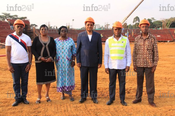 Le Premier ministre posant jeudi avec les ministres originaires du Woleu-Ntem lors d’une visite du chantier du stade d’Oyem