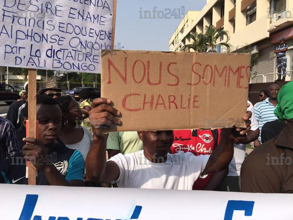 « Nous sommes Charlie », pouvait-on lire sur un petit carton brandit à côté des pancartes et banderoles hostiles au président gabonais Ali Bongo Ondimba.