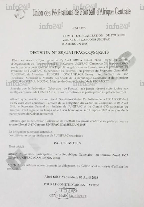 La décision de disqualification du Gabon de ce tournoi a en effet été prise par décision n°001/UNIFFAC/CO/SG/2018 hier, jeudi 5 avril à Yaoundé, à l’issue d’une réunion extraordinaire du comité d’organisation dirigé par Guy-Marc Mokopete. Selon le document que s’est procuré la rédaction d’Info241, la FEGAFOOT n’aurait "jamais réservé suite aux multiples courriels de l’UNIFFAC aux fins de confirmer sa participation au présent tournoi".
