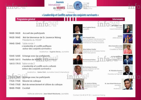 L’Association « Veuvage, Droits, Accompagnement et Perspectives » (VEDAP) organise le 17 juin prochain à Paris, au Palais du Luxembourg, sous le haut patronage de Mme Anne Chainlarche, sénatrice de Seine-et-Marne, un colloque sur le thème : « Leadership et conflits autour des conjoints survivants ». Cet événement s’inscrit selon la présidente du VEDPAP, Dr Laurence Ndong dans le cadre de la commémoration de la journée internationale des veuves, célébrée chaque 23 juin par les Nations Unies.