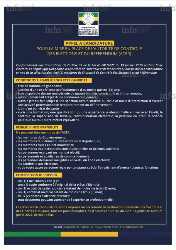 Le communiqué fixe enfin les modalités de dépôt des candidatures. Les intéressés devront soumettre leur dossier « au Secrétariat de la Direction Générale des Élections et des Libertés Publiques, tous les jours ouvrables, de 8 heures à 15 h 30, du lundi 14 juillet au lundi 21 juillet 2025, dernier délai  ».