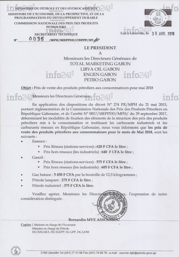 Pour tout le mois de mai, le prix des réseaux des stations-services de l’essence demeure à 620 francs le litre, et le prix hors-réseau (les industriels) est lui fixé à 640 francs le litre. Le prix réseau du gasoil passe de 560 à 575 francs le litre. Le prix hors réseau du gasoil est de 605 francs le litre. Le prix du gaz butane reste également inchangé à 5450 francs pour la bouteille de 12,5 kg, alors que le pétrole lampant reste également à 275 francs le litre, tandis que le pétrole industriel est à 375 francs le litre.