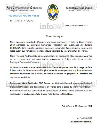 Ce jeudi, le fédéral PDG de France Fred Maïssa par ailleurs l’une des personnes citées comme à l’origine du mécontentement des soutiens d’Ali Bongo, a via un communiqué, fustigé la véracité de ce courrier. Évoquant même que les douze signataires ne se reconnaissaient pas dans celui-ci. Avant de promettre des poursuites. Une version des faits qui diffère de celle que nous avons eu le même jour de l’un des signataires.