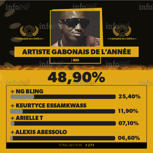 J-Rio a été sacré artiste gabonais de l’année après avoir recueilli 1602 voix soit 48,90% devant NG Bling (2e avec 25,40%), Keurtyce Essamkwass (3e avec 11,90%), Arielle T (4e avec 7,10%) et Alexis Abessolo (dernier avec 6,60%).