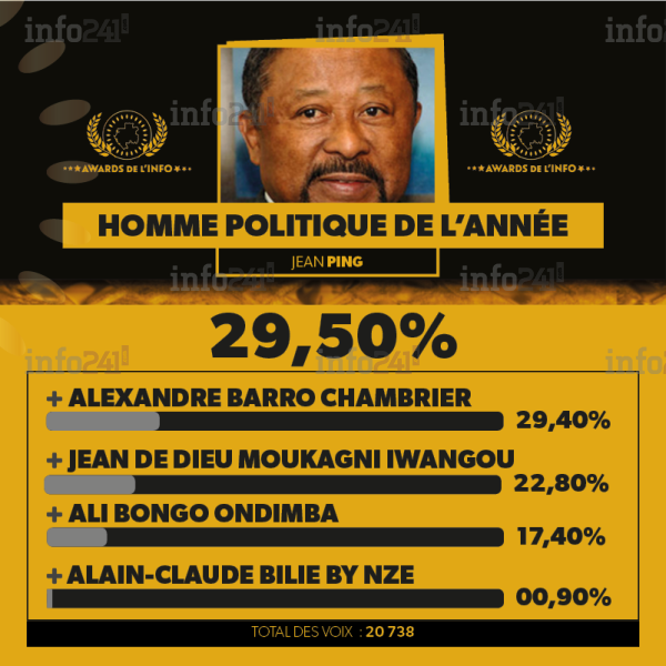 Ainsi dans la catégorie « homme politique » de l’année, la victoire est revenue à Jean Ping qui a recueilli 6 128 voix soit 29,50% suivi d’Alexandre Barro Chambrier (2e avec 29,4%), Jean de Dieu Moukagni Iwangou (3e avec 22,8%), Ali Bongo (4e avec 17,4%) et Alain-Claude Bilie by Nze (5e avec 0,9%). Cette catégorie est celle ayant reçu le plus de suffrages des internautes participant à cette votation en ligne.