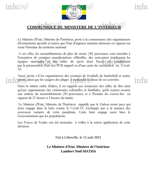 Comme pour gâcher la tenue de nombreux tournois de sports collectifs organisés en cette période estivale, le ministre gabonais de l’Intérieur Lambert-Noël Matha a fait hier une piqure de rappel à l’endroit de leurs organisateurs. En effet, rappelle-t-il, l’état d’urgence sanitaire imposé par le gouvernement en raison de la pandémie de coronavirus est toujours de rigueur. Celui-ci interdit toujours les manifestations sportives à quelques rares exceptions. Une manière de faire baisser l’effervescence qui avait déjà gagné le pays.
