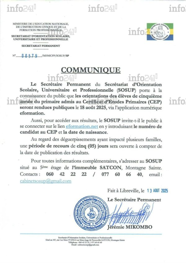 Alors que la rentrée des classes pour l’année scolaire 2025-2026 se profile à l’horizon au Gabon pour le 1er septembre, il ne manquait plus que le sort réservé aux élèves qui débuteront le secondaire. Ce mercredi 13 août, le Secrétariat permanent du Secrétariat d’orientation scolaire, universitaire et professionnelle (SOSUP) a communiqué sur les résultats de l’orientation en 6e des admis au CEP, qui seront disponibles ce lundi 18 août.