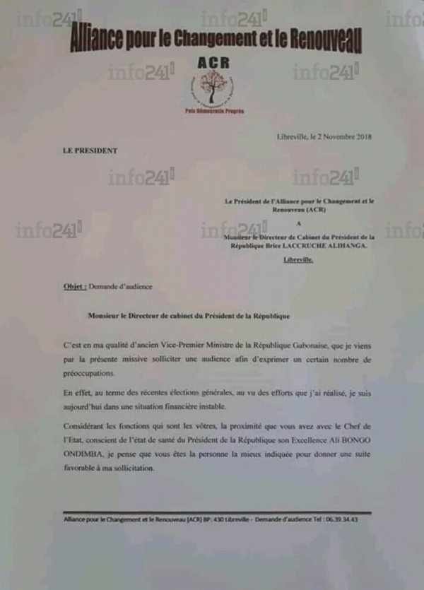 "C’est en ma qualité d’ancien Vice Premier Ministre de la République gabonaise, que je viens par la présente missive solliciter une audience afin d’exprimer un certains nombres de préoccupations" avait écrit l’ancien numéro deux du gouvernement gabonais dans sa demande d’aide à son désormais ennemi juré d’aujourdhui.