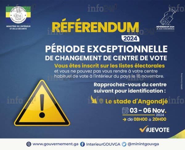 Du 3 au 6 novembre 2024, les électeurs qui ne peuvent se rendre dans leurs circonscriptions habituelles pour des raisons de force majeure sont invités à se présenter au stade d’Angondjé, de 8h à 20h. Ce site sera le lieu de dépôt de leurs demandes de changement de centre de vote. En cas d’approbation, ils pourront accomplir leur devoir civique soit au stade d’Angondjé, soit au Palais des sports, les deux sites étant aménagés en bureaux de vote pour l’occasion.