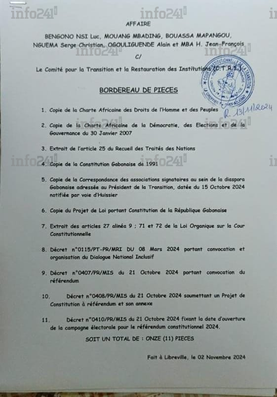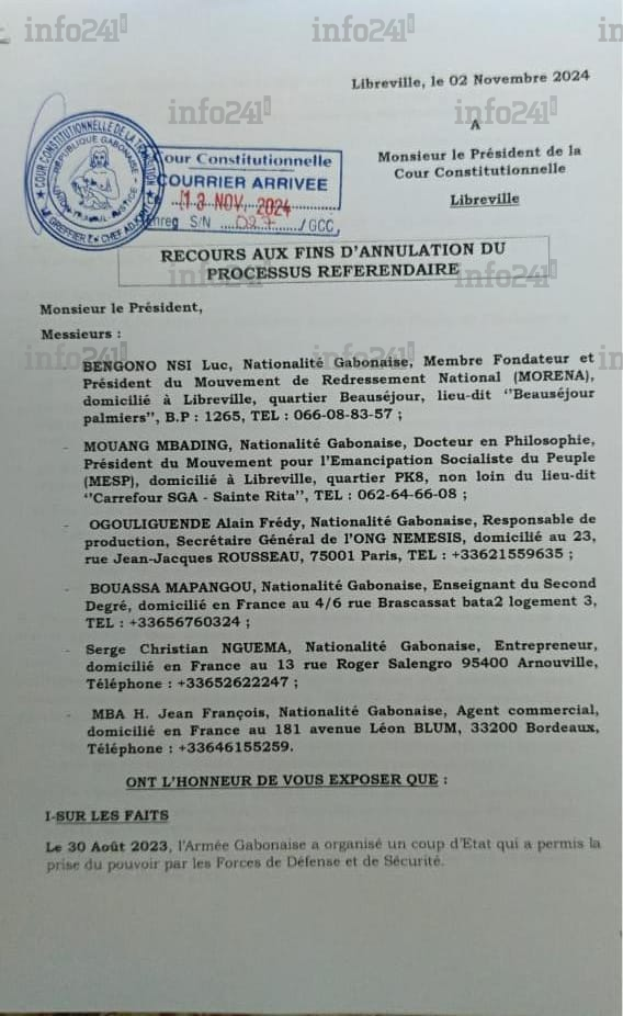 La requête dont Info241 a obtenu copie mentionne également la Charte africaine de la démocratie, des élections et de la gouvernance. Ce texte stipule que l’accession au pouvoir par un coup d’État ou toute autre action anticonstitutionnelle doit être sanctionnée. En conséquence, les requérants estiment que le général Oligui Nguema, chef de la transition, ne peut organiser un référendum sans enfreindre cette charte.