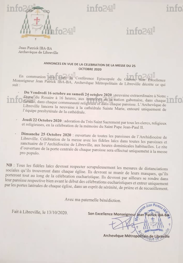 Dans une note d’information intitulée “Annonces en vue de la célébration de la messe du 25 octobre 2020” parvenue à notre rédaction cet après-midi, Jean Patrick Iba-Ba, l’archevêque métropolitain de Libreville confirme ce qu’avaient déjà annoncé depuis Oyem, les Monseigneurs Jean Vincent Ondo Eyene et Mathieu Madega : la réouverture des lieux de culte se fera le 25 octobre.