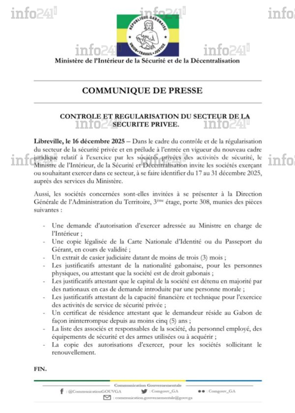 Les entreprises de sécurité privée exerçant au Gabon sont priées de se faire connaître, avant la fin de l’année, des services du ministère de l’Intérieur. Selon ce communiqué parvenu à Info241, cette vaste opération s’effectue « dans le cadre du contrôle et de la régulation du secteur de la sécurité privée et en prélude à l’entrée en vigueur du nouveau cadre juridique relatif à l’exercice par les sociétés privées des activités de sécurité ».