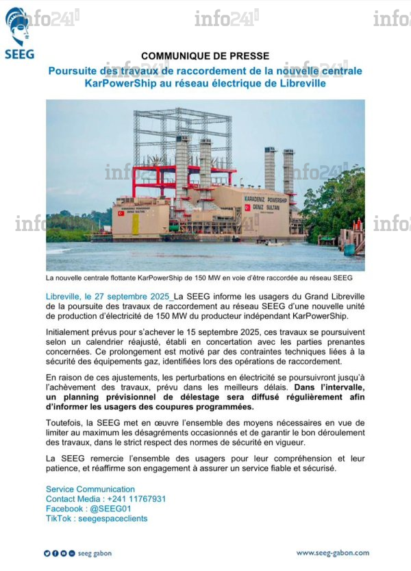 Le communiqué de presse de la Société d’énergie et d’eau du Gabon (SEEG), publié ce samedi soir, a confirmé ce que beaucoup craignaient déjà : le Grand Libreville va connaître de nouveaux délestages en série. L’entreprise publique a annoncé la poursuite des travaux de raccordement de la centrale flottante KarPowerShip de 150 MW au réseau électrique, un chantier initialement prévu pour s’achever le 15 septembre mais désormais prolongé à une date indéterminée.