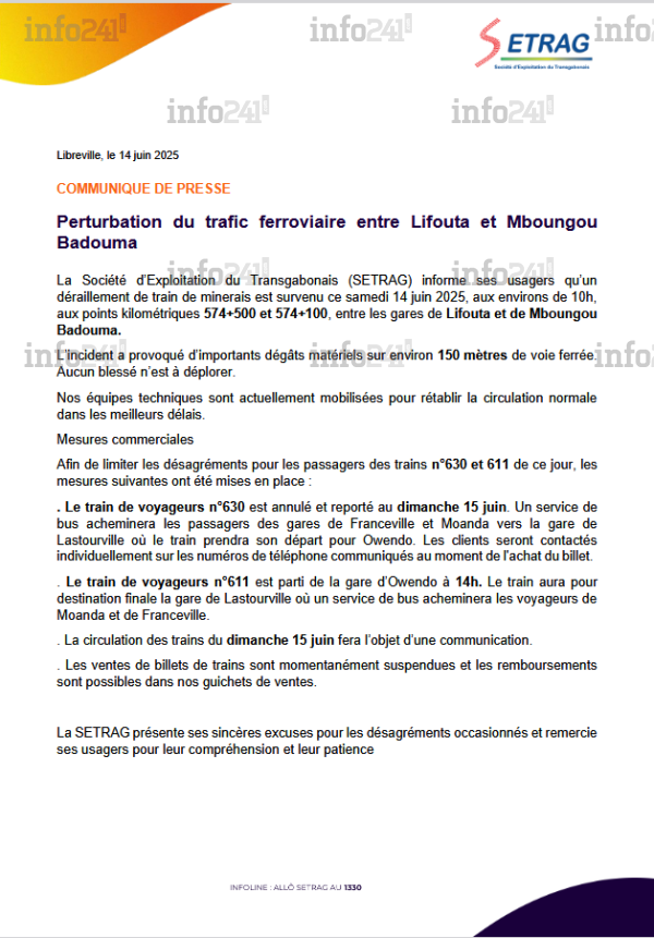 Plusieurs mesures ont été prises pour limiter les désagréments pour les usagers. Le train de voyageurs n°630, initialement prévu ce samedi, est annulé et reporté au dimanche 15 juin. « Les voyageurs au départ de Franceville et Moanda seront transférés en bus jusqu’à la gare de Lastourville où un train les prendra en charge jusqu’à Owendo », précise la société. Chaque passager sera contacté individuellement.