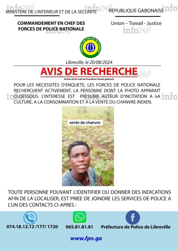 Les autorités rappellent que ces pratiques sont strictement prohibées sur l’ensemble du territoire national. « Les forces de police nationale recherchent activement la personne dont la photo apparaît ci-dessous. L’intéressé est présumé auteur d’incitation à la culture, à la consommation et à la vente de chanvre indien », indique l’avis de la police. Même si la vidéo avait pour objectif de créer du buzz sur les réseaux sociaux, cette action reste passible de poursuites en vertu de l’article 26 du Code de procédure pénale gabonais.